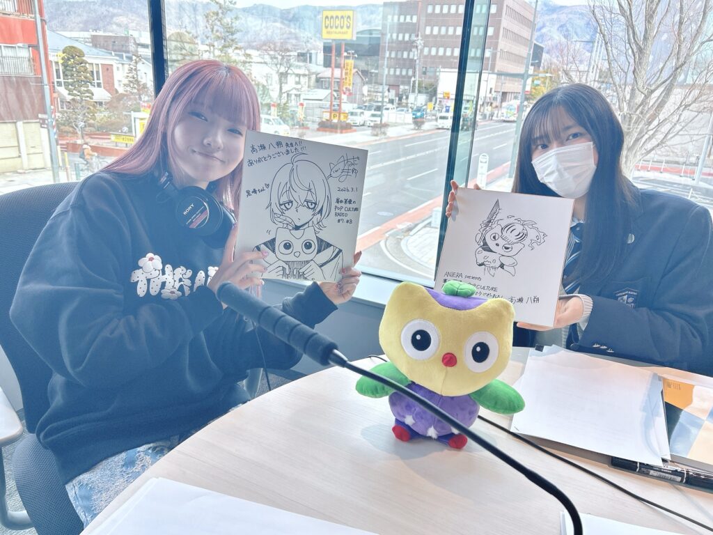 この番組には、パーソナリティである声優の峯田さんが、県内で活躍するポップカルチャーの若手アーティストと対談するという企画があります。その栄えある第1号ゲストとして在学中漫画家デビューを果たした高瀬さんに白羽の矢を立てていただき、嬉しい出演となりました。