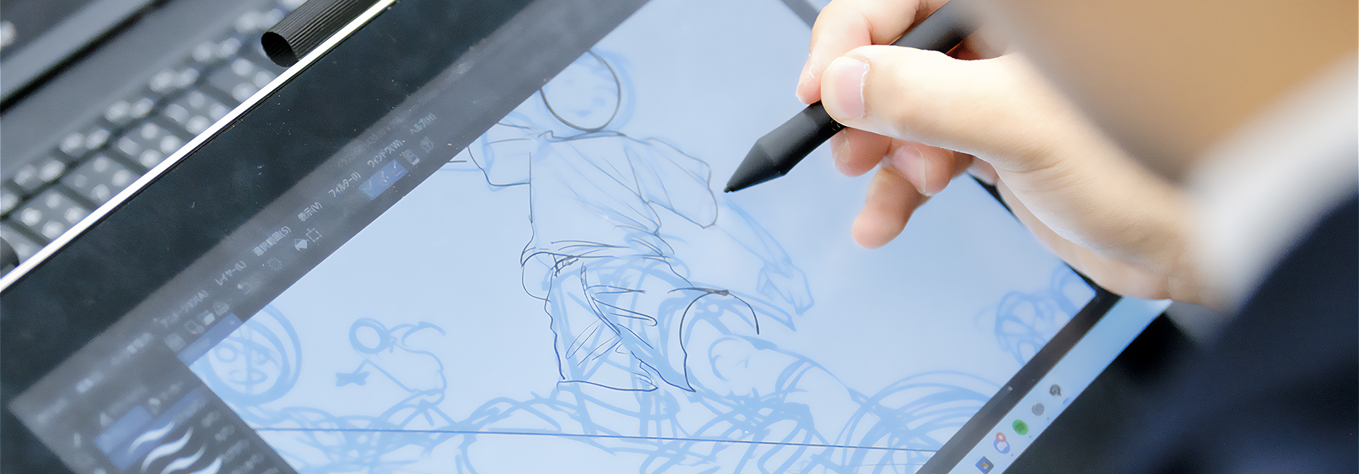基本的なペンの使い方から、原稿用紙の使い方、PCやタブレットを使ったデジタル作画などマンガを描く基礎をしっかりと学びながら、生徒はオリジナル作品を作りあげていきます。プロのマンガ家から指導を受ける授業では、より実践的な技法などを知り、個々の表現力を高めています。
